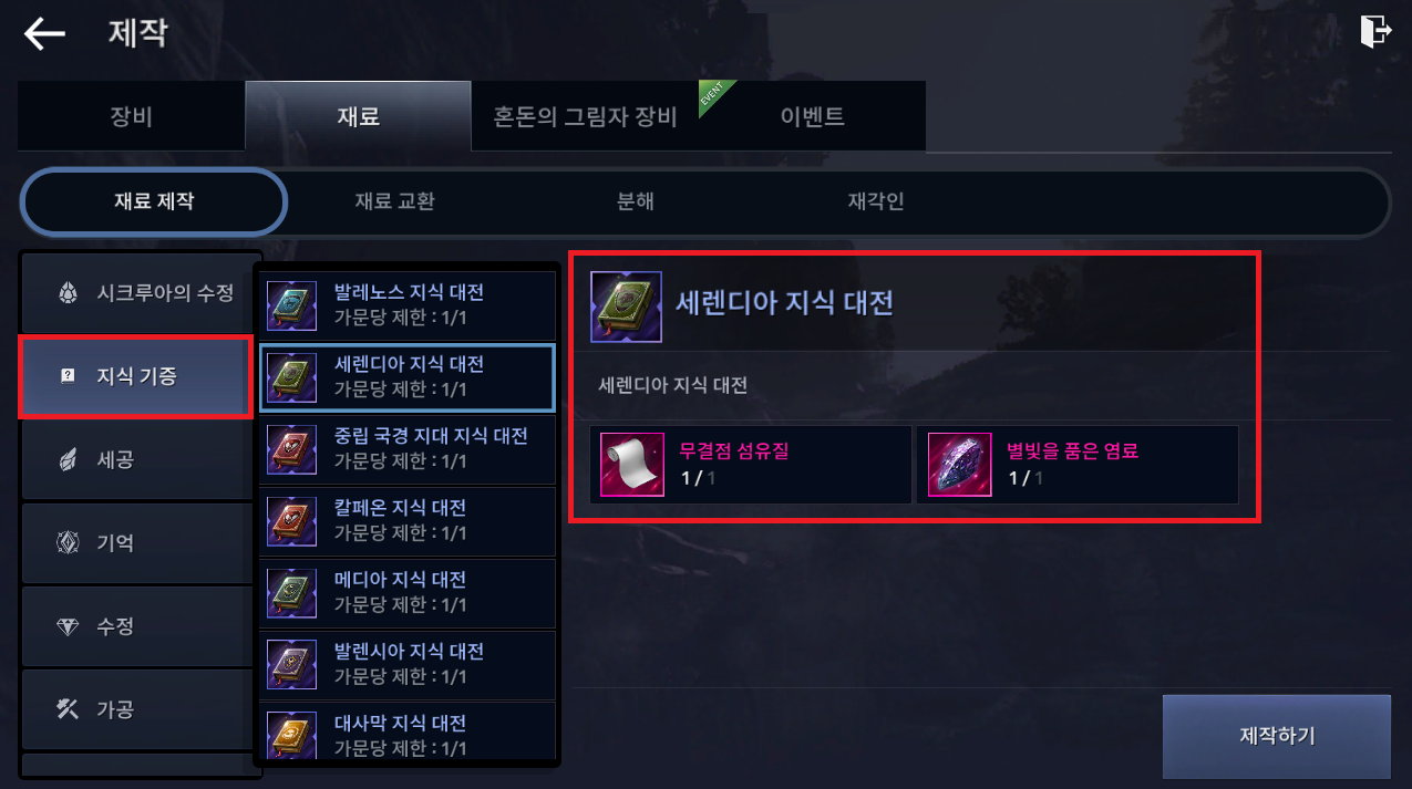 [제작 > 재료 > 재료 제작 > 지식 기증] 메뉴에서