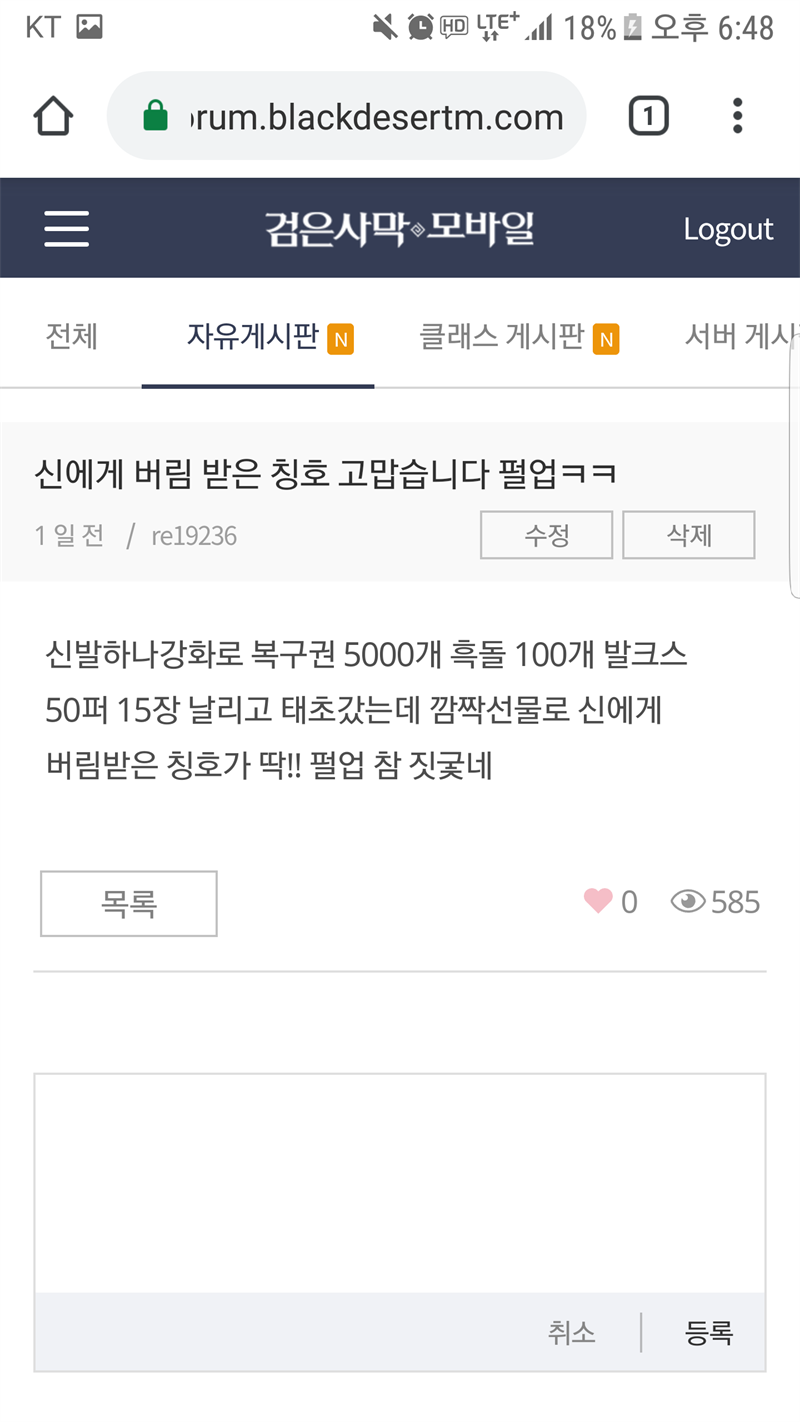 어제 강화실패후 복구하기위해 조르다인의 군수품 상자 3개를 지르고 월요일 상품인 돌복권 세트를 구입하고 도전 했지만 결과는 참패 이 미친 신발의 방탄력을 뚫지는 못했습니다 하지만 펄어비스님은 저를 버리지 않으셨습니다 자사랑 사카투 금주화에서 심연투구를 따닥! 저를 위로해 주셨습니다. 펄어비스를 찬양합시다.