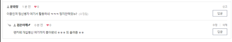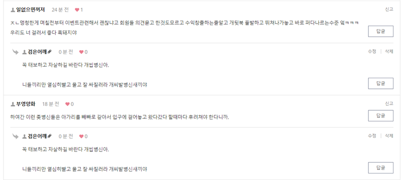 찔리면 욕설한다고? 걍 니네가 줫병신같아서 욕설하는거야, 신경끌테니 제발와서 분탕치지 말라고 벌레들아.