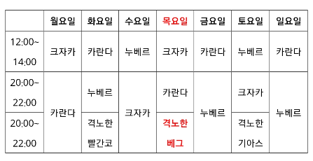 목요일 머스칸으로 바뀌고 일요일 베그요