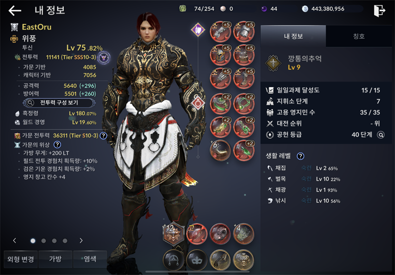 제 전투력 구성상태에서 말씀드리자면 저는현재 토벌지식이 낮고 장비강화와 기술수련, 펫수집이 낮다고 나오더라구요