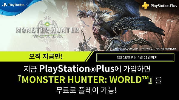 '드디어 Monster Hunter: World가 PS Plus 무료 게임으로 등장했습니다. PS Plus 회원이라면 이제 “Monster Hunter: World”를 원하는만큼 플레이 할 수 있습니다! PS Plus를 사용하면 PS4를 더욱 즐길 수 있습니다. 지금 가입하세요!