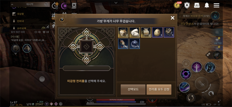 이미 한계치를 한참 넘어서 무게 줄이는걸로는 안될거고 감정 될때까지 전리품 삭제 해야함