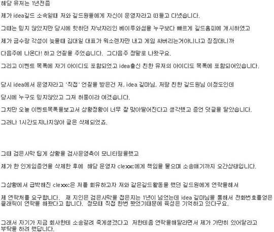 해당 게시물에는 해당 전직 QA 담당자가 이전 길드에서부터 본인이 운영진이라고 노출했으며 게임 내 고급 정보를 길드원에게 흘렸다는 내용이 담겨있다. 게시물을 올린 이용자는 전직 QA 담당자가 다른 길드로 적을 옮긴 이후에도 정보를 지속적으로 유출해 길드 단위의 부당 이득을 얻었다고 주장하고 있다.