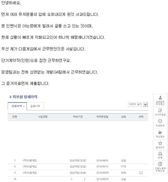 ◇ 논란이 된 전직 QA 담당자의 인증글로 인해 논란이 더욱 확대됐다.또한 해당 인물이 회사로부터 규정 위반 행위를 의심받자 본인과 접촉하려 했다는 내용과 이전 개발 QA팀 소속이었다는 인증까지 담겨 있어 논란이 더욱 확대되는 중이다.