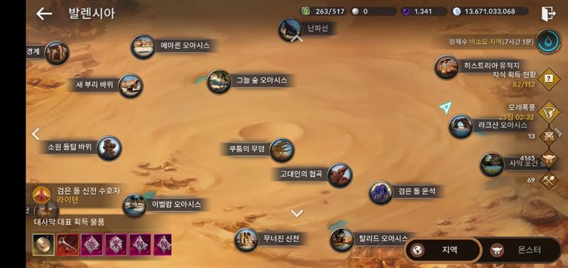 대사막같은경우엔 현재 가장 메리트가 되는건 사막발굴런 혹은 검은돌제단을 통해 에다나주화를 수급 후 검은돌신전 봉헌에서 나오는 토벌권과 각종 보답품