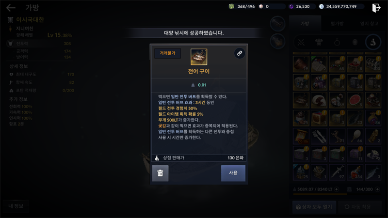 예.) 전어300리 잡으면 구이 만들어서 템으로 교환 등