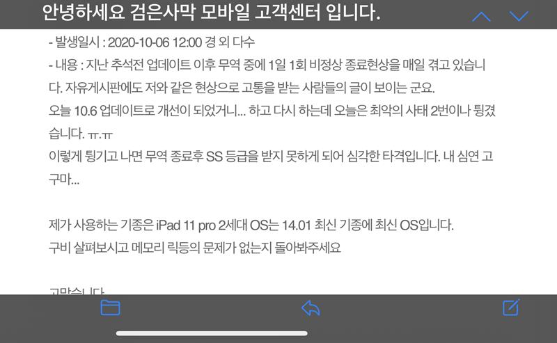 추석주간 업데이트 이후 무역중 팅김현상으로 고통을 받다가 이번주 업데이트로 나아지기를 기대했는데 두번 팅겨 이건 아니잖어 펄없에 알려라도 줘야겠다 싶어서 문의를 넣었는데. 답변이 드드드