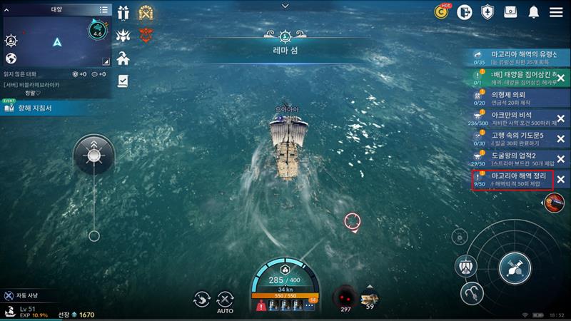 첨부사진1 --- '마고리아 해역 정리' 카운팅은 9/50 이라고 되었고,