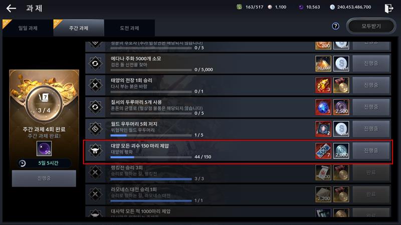 첨부사진4 --- 주간과제 '대양괴수 처치' 카운팅은 첨부사진2와 같이 44/150으로 변함이 없습니다.