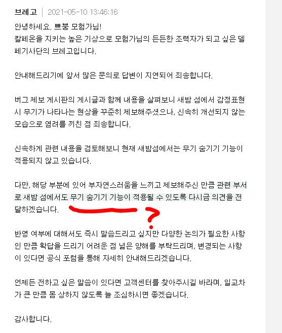 그래서 다시 문의를 넣었어 새밤섬에선 현재 무기숨기기가 제대로 되고있고