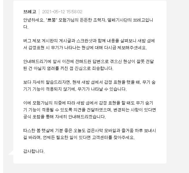 새밤섬은 무기가 자꾸 생긴단말야.. 그래서 버그게시판에 글쓰고 문의넣었는데