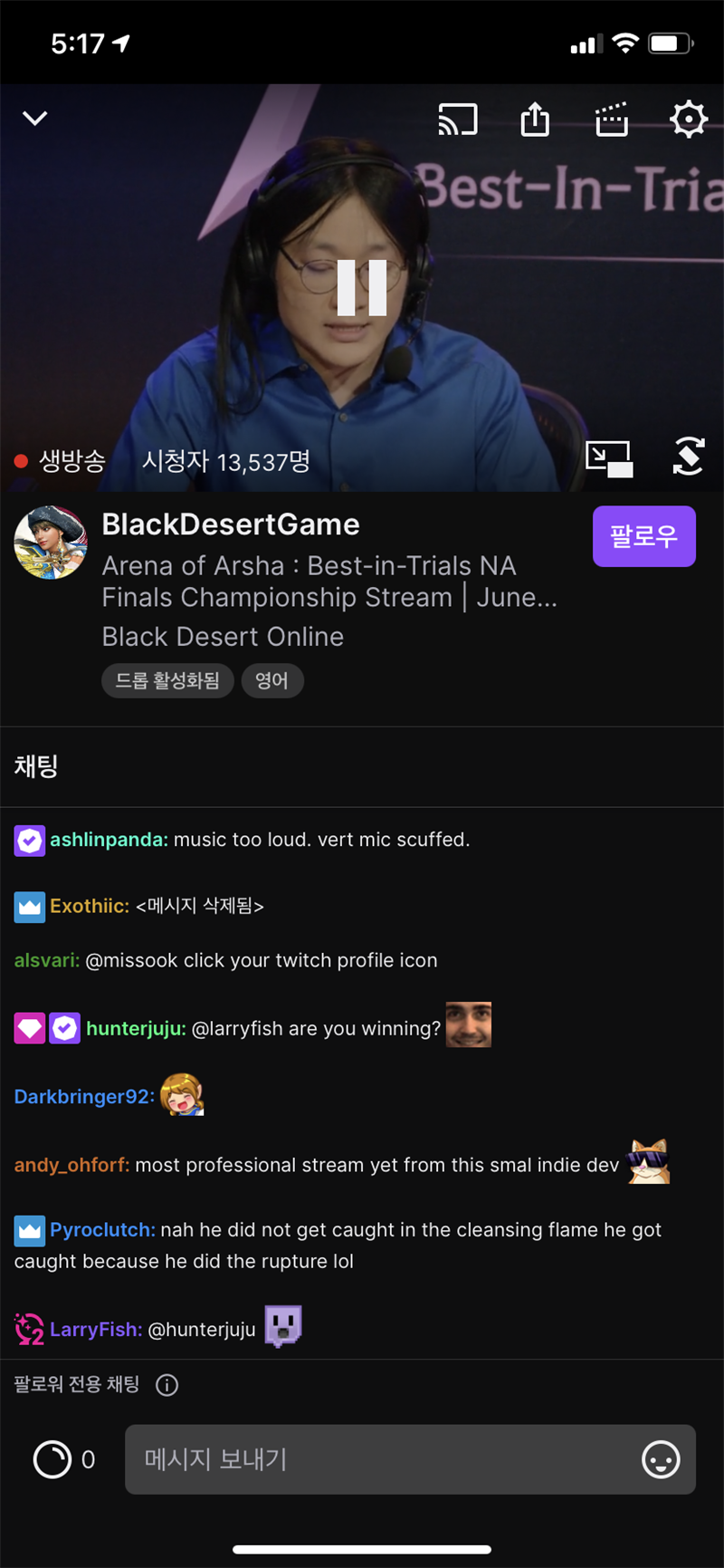 피검 지금 트위치에서 대회하는중