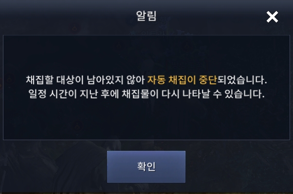 위 문구가 뜬 이후에는 재접해도 채집이 불가했습니다.
