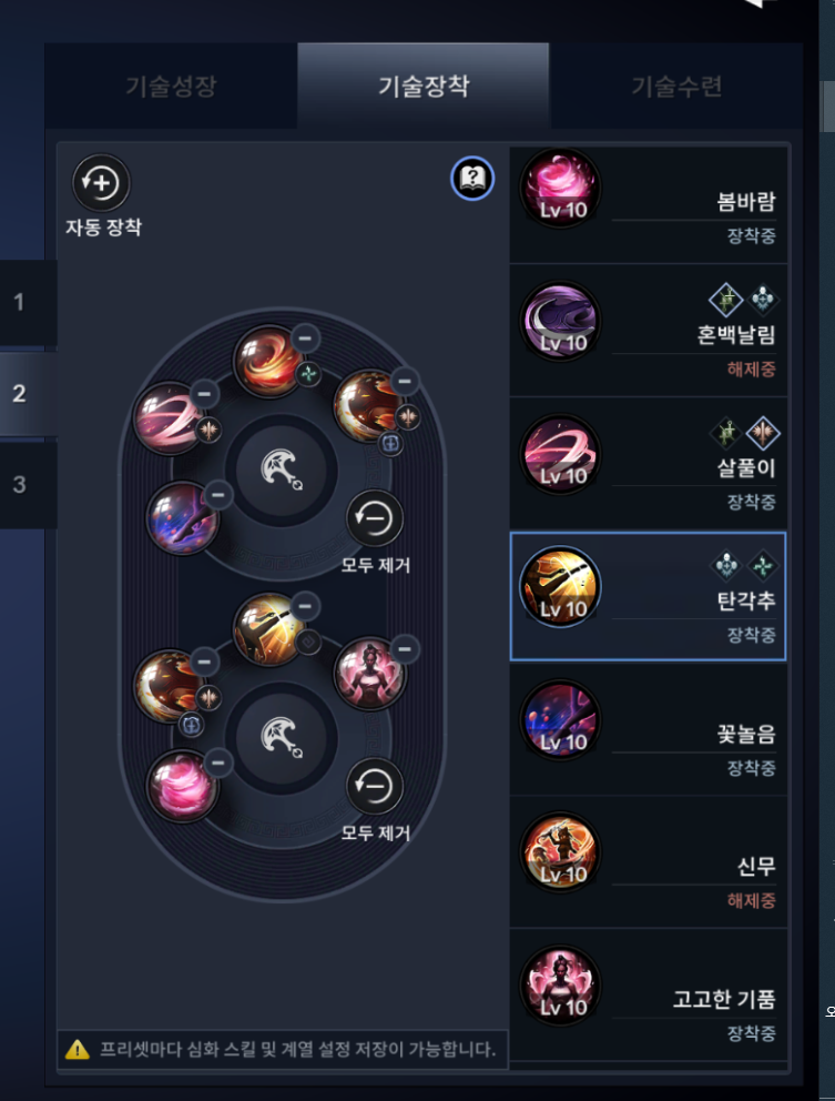 스킬1의 탄각추 계열 선택 했으면.. 다시 스킬2, 스킬3번의 탄각추 계열도 다시 선택해 줘야 합니다..