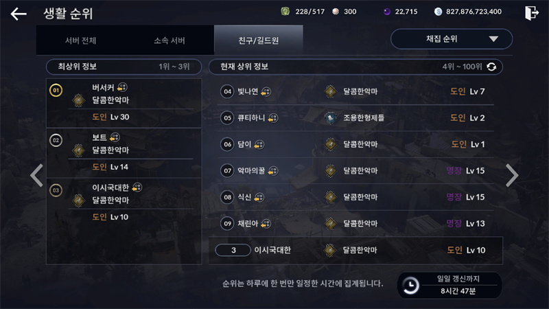 지 친구목록에서나 채집 순위뜨지ㅋㅋ