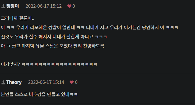 지들보다 돈 안쓰고 피빕은 잘해서 우승하니까 꼴받아서 그러는거냐?