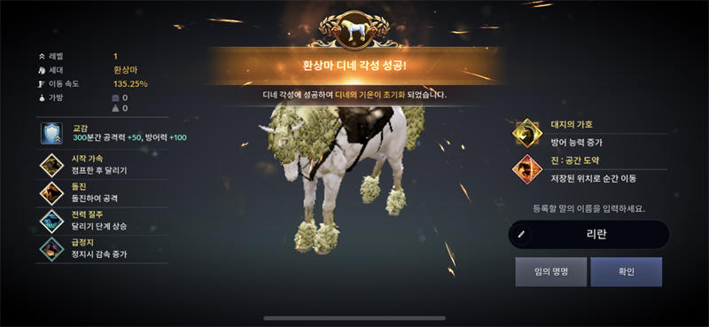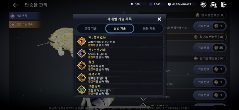 전용 기술은 대지의 질주, 대지의 가호 두 가지 중 선택할 수 있네요. 질주는 질주 끝나고 쿨 2-3초밖이 안돼서 거의 계속 쓸 수 있어요. 순간이동은 일반 기술 목록에는 있는데 100번 넘게 교환해도 안 뜨네요. 안돼는건지…