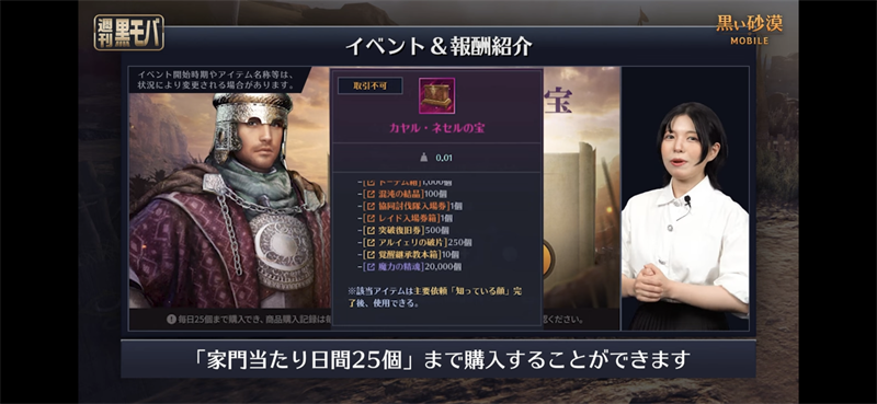 이쪽은 기간중 ‘카얄.네세르’의 보물 이벤트’를 1개 맞춰 2억 실버로 ’가문당부 일간25개‘까지 구입할 수 있습니다. 구입 후에 사용하면 혼돈악세사리 제작 등에 사용하는 ‘혼돈의 축’이나 ‘아크라드’를 손에 넣을수도 있을 지 몰라요! 이벤트는 7일간 개최될 예정이므로 개최까지 콘텐츠 ‘토벌’이나‘월드경영’등을 플레이해서 확실히 실버로 모아두자구요!