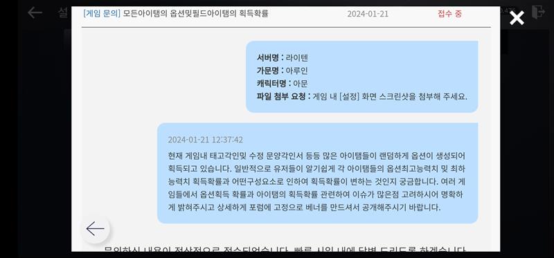 이렇게 문의 했는데 뭐 답변이 어떻게 올지 궁금하면서도 메크로 답변올거 예상은 되지만 그래도 답변온거 공개해드릴 예정입니다. 현재 게임내 아이탬 획득 확률과 많은 아이탬들의 최고수치옵션 밎 사용옵션 사용하지않는 옵션들의 등장요소등등이 명확하게 공개 되지않는등등 미심쩍은 부분이 너무많은 상황입니다. 여러분도 함께 문의로 공개요구 해주시면 펄업측이 문제에 대한 인식을 하수 있을것이라 생각 됩니다.(뭐...이건 기대는 전혀 하지않지만...) 아직은 검사를 더 하고싶은 맘으로 많은 분들이 관심 가져주시고 요구해야할거 같네요.