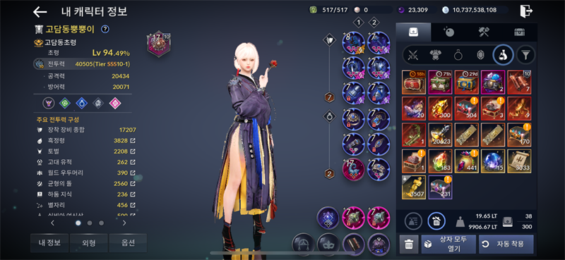 1. 장비: 일단 장비를 보니 무기류, 방어구류를 8강 도전하셔야 합니다. 칠흑장비로 하시면 8강 도전 가능하세요. 칠흑장비는 7강아래로 떨어지지 않으니 칠흑 5강 = 8강장비로 변경가능합니다.