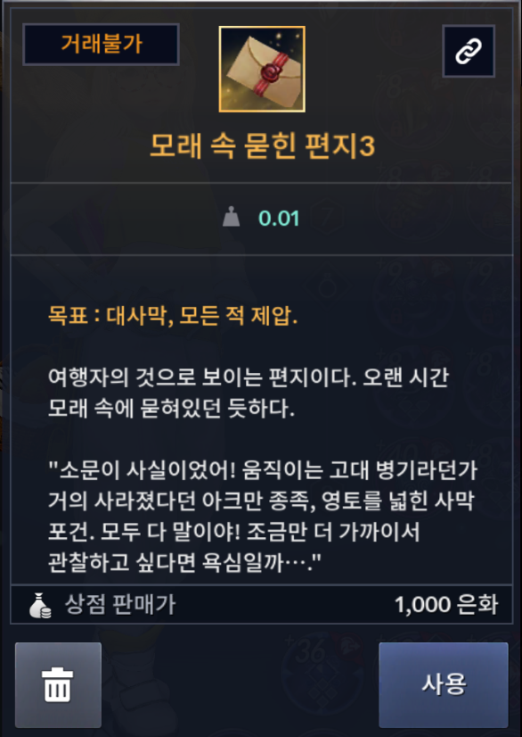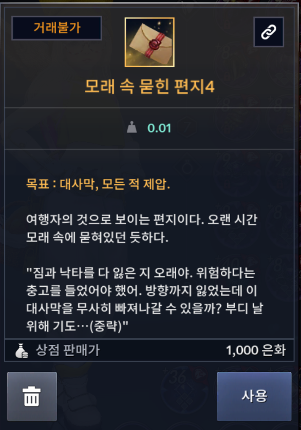 이 뜻은 대사막을 사냥하다 보면 나오는 퀘스트 스크롤중에서 모래 속 묻힌 편지를 뜻합니다. 다른것은 기도문일뿐이고 여러 사람(여행자)의 이야기를 내포하고 있는것은 모래 속 묻힌 편지밖에 없습니다. 이 스크롤을 모아서 담아둘 곳이 필요하다라는데 그 다음을 유추할 수 없습니다. 스샷속 이미지는 영지에 여관 이미지인데 주변 그림들도 한번 세심하게 볼 필요가 있을것 같습니다. 거의70% 왔다고 봅니다.