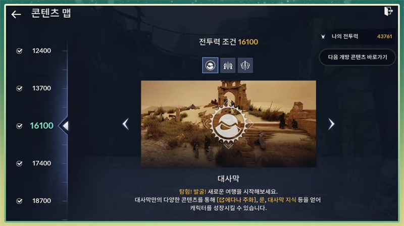 이야기 진행을 하지 않아도 전투력에 따른 콘텐츠 오픈