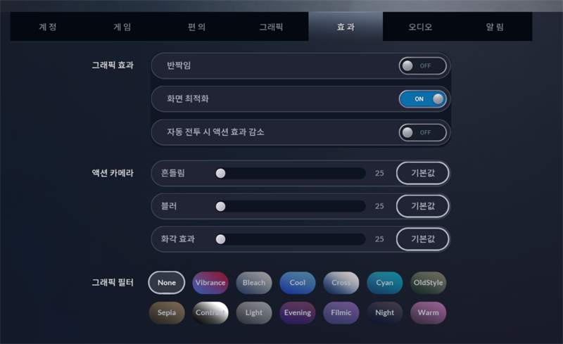 설치한 후 기존과같이 세팅을하는데 설정-효과-액션 카메라 효과가 기존에는 0까지 줄이는 것이 가능했는데