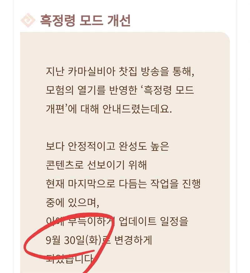 그냥 열기 롤백해놓고 완전히 다듬어졌을때 동시에 업뎃하는게 맞지 않냐? 솔직히 흑정모드 손보는게 뭐가 그리 어려운 작업인지 전혀 이해도 안되는데 이걸 4주동안이나 틀어막아두는지