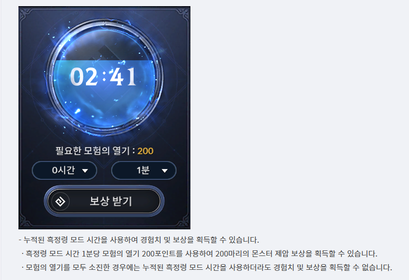 열기 200 = 흑정령 모드 1분 >>> 열기 60000 = 흑정령 모드 300분 = 5시간