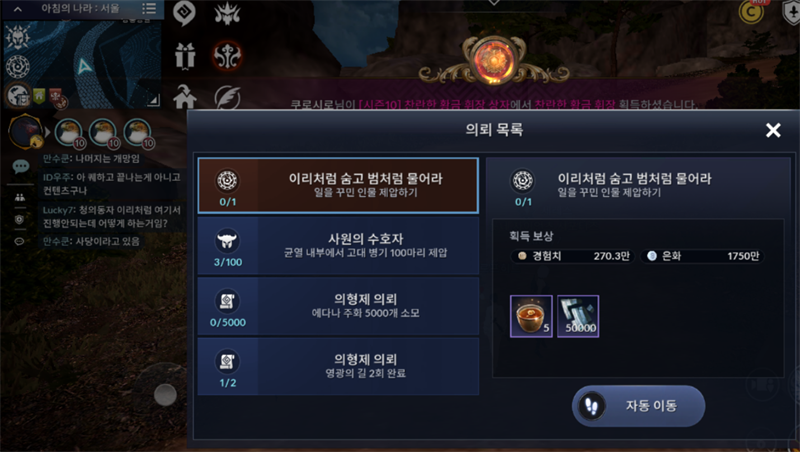 청의동자 시험: 오른 쪽 원안에 공격 켜놓고 들어가 있기, 흰색 불꽃 사이로 지나가서 보물 상자 열기, 여우 4마리 중 오른 쪽 여우 공격.