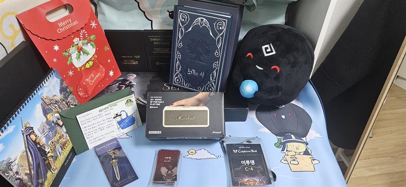 아래는 이번 연회때 제가 받아갔던 상품들입니다. 바닥에 깔린 마우스 장패드와(미니게임 경품으로 얻었습니다) 가운데의 마셜 스피커(럭키드로우 보상이에요) 외에는 기본적으로 연회에 참석한 모든 유저들에게 다 주어지는 것들이었어요. 특히 이번에는 한정판 검사모 커스터마이징 키보드까지 연회에 온 모든 유저들에게 주어졌었고요.