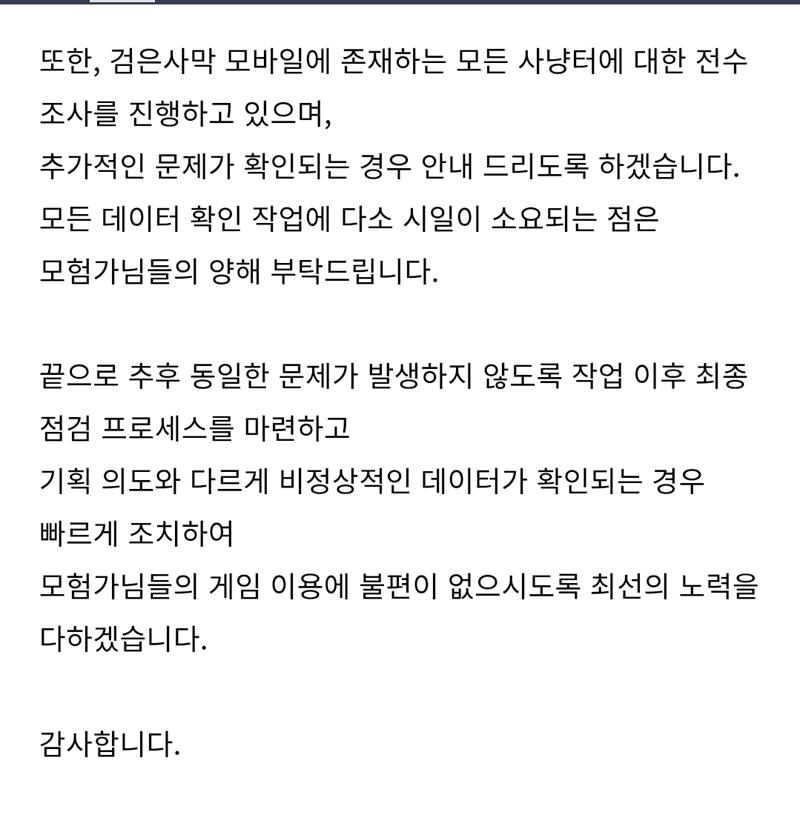 모험가님들의 게임 이용에 불편이 없으시도록 최선의 노력을 다하겠습니다.
