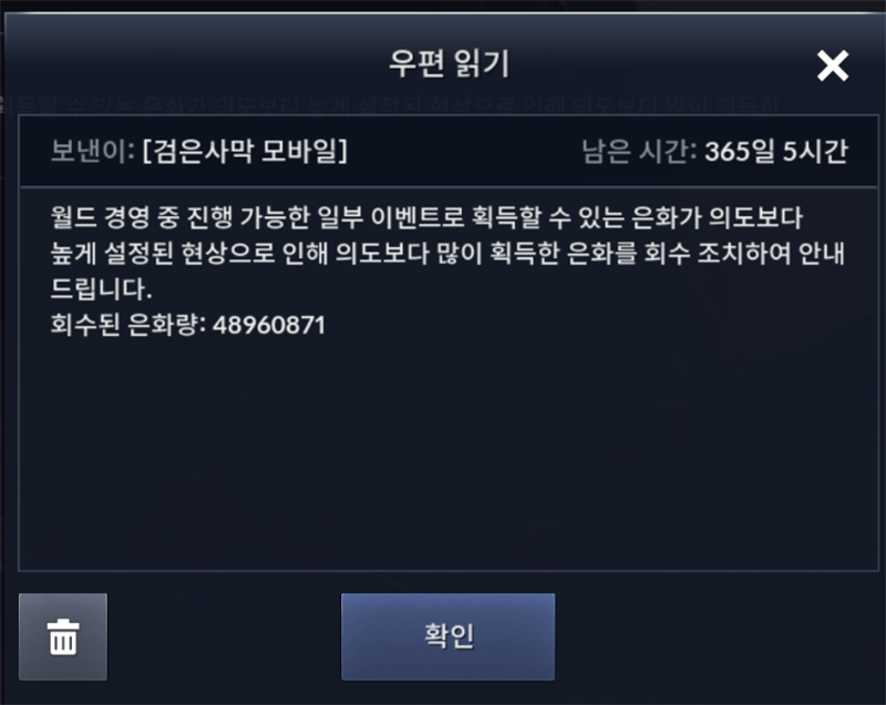 다른 유저분이 펄업에서 회신받은 은화 회수 내역을 보면