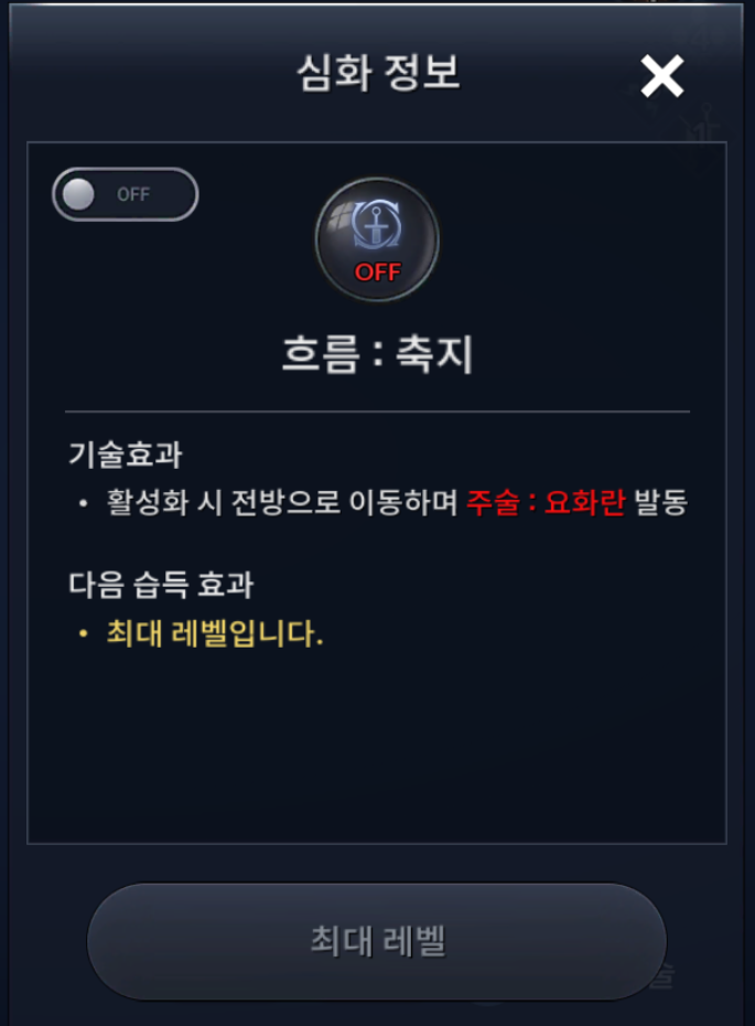 또한 이 스킬에는 흐름 : 축지가 존재합니다. 축지를 ON 하면 타겟 방향 혹은 입력된 방향으로 일정 거리를 순간이동하고,도착 지점에 역류(장판)를 소환하는 구조입니다. 스킬 형태 자체는 ‘심신의 벽’과 비슷하게 진입/이탈 과정에서 장판을 깔고 움직일 수 있다는 점에서 매력적입니다. 하지만 매구는 구조적으로 근접 교전이 성립하기 어려운 클래스이기 때문에, 현 메타에서 축지는 사실상 도망용 이동기로만 의미 있게 사용되고 있습니다. 반대로 축지를 끄고 원거리 견제 용도로 사용하는 편이 실전 효율이 더 좋으며, 결국 축지 ON 상태의 활용도는 지나치게 제한되어 있다고 생각합니다. 따라서 [주술 : 요화란]은 현재 환경에 맞게 장판의 활용성과 유틸성을 강화하는 방향의 개편이 필요하다고 봅니다.