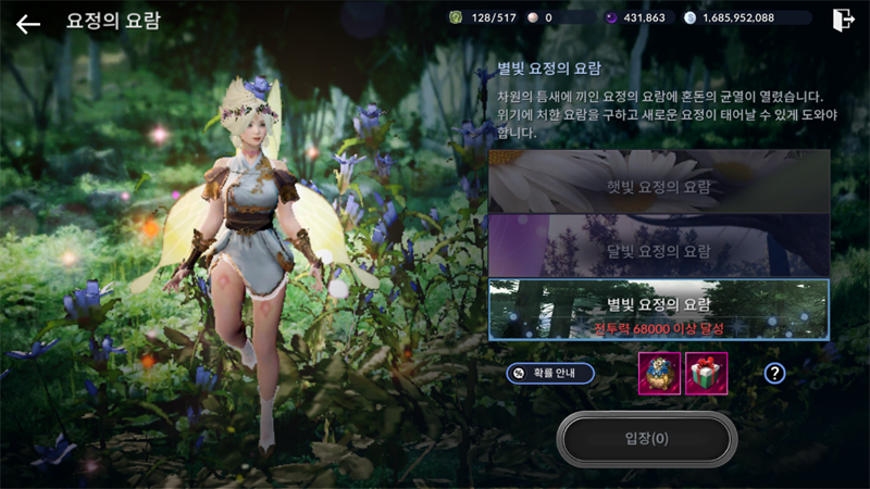 예를 들어 별빛 요정의 요람은 [달의 브로치] 심연 +1 돌파 및 전투력 68,000 달성 시 이용 가능하며, [달의 브로치] 심연 +1 돌파에 성공하였으나 전투력이 68,000 미만인 경우에는 전투력 제한을 확인하실 수 있습니다.