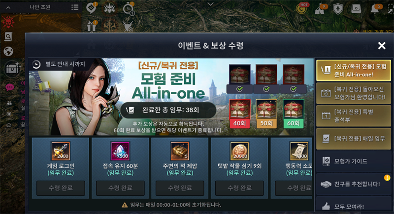 어제 다시 다운로드받아서 복귀유저라고 뜨는데 모험일지는 어디서 확인할수있나요??