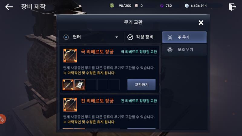 이 화면은 장비교환권을 사용해서 각성과 계승캐릭간 무기/보조무기를 교환하는 화면입니다.