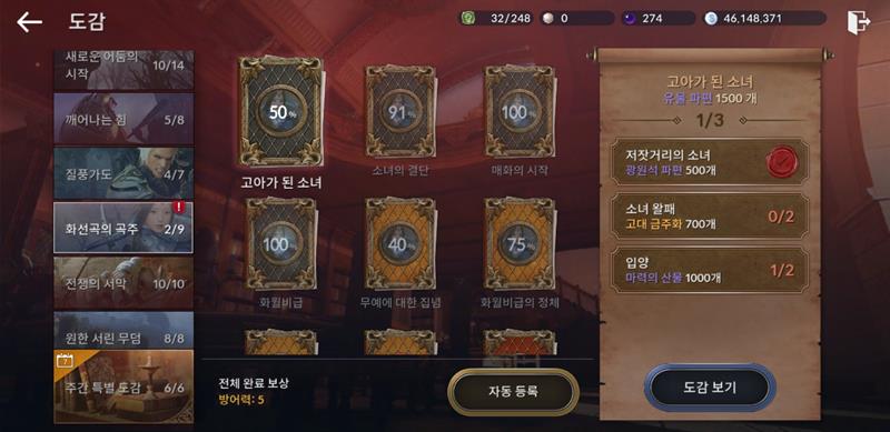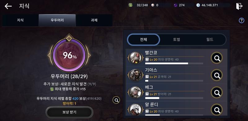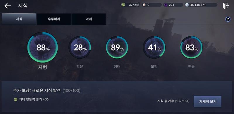 메인 퀘스트 진행한 만큼 생태,모험,지형,인물 등 지식작 진행+도감작업 (시간절약을 원한다면 공,방지식 위주로 진행)