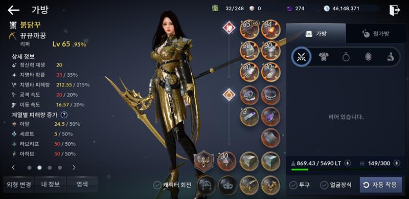 장비강화는 43강을 목표로 진행 + 심연장신구 2피스 , 신화장신구 3피스 (투자대비 가장 큰 공명효과)
