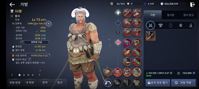 또 신화장비15개를 합성해서 만들거나 거래소에서 구매한 심연악세는 100%확정강화인 3강까지만 쓰시다가 녹여서 태고악세만들때 쓰면됩니다. 그리고 모든 장비들은 영지에서 각성을 통해 투력높인뒤 사용하시는게 좋습니다.