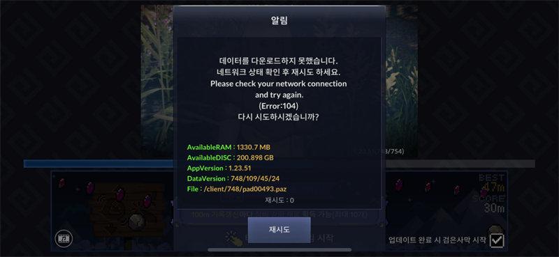 그런데 초기 데이터 다운에서 오류가 생깁니다