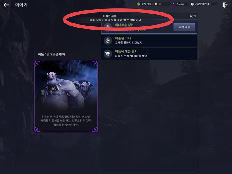 대양 100마리 잡는 퀘스트 하려고 하니 의뢰 초과라고 안 받아져서