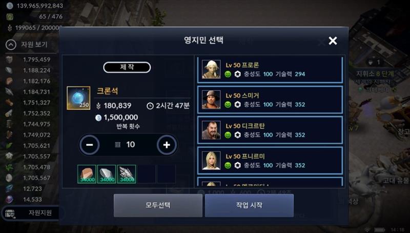 크론석 제작하는데 영지민 5명, 식량 18만, 시간 2시간 47분 등등 사용해서 250개 제작 돌리는데