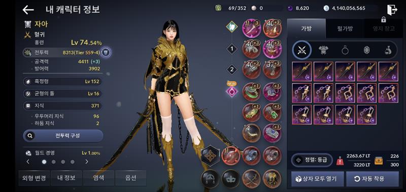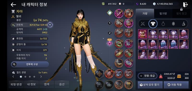 장비 - 먼저 태고장비 다 맞추시고 , 각성도 하시고 강화스톤 되는대로 40강까지 강화해주세요
