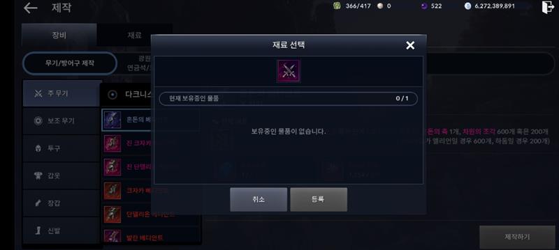 이번에 어여쁜 우리 다크니스한테 멋진 혼돈 칼 주려고 이야기 이벤트 클리어해서 혼돈축 얻어서 바로 제작하러 들어갔는데... 왜 없죠..