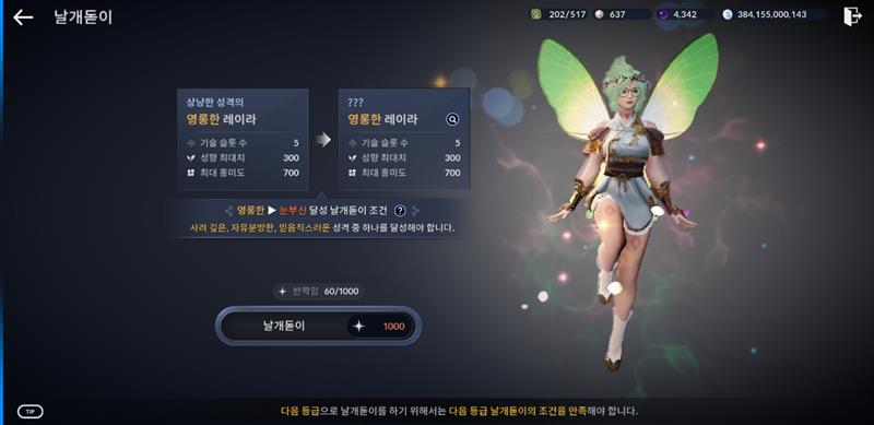 가장높은 명랑+다정이 각각 280, 나머지가 각 150이상이 된후 날개돋이를 하시면 사려깊은이 될겁니다.