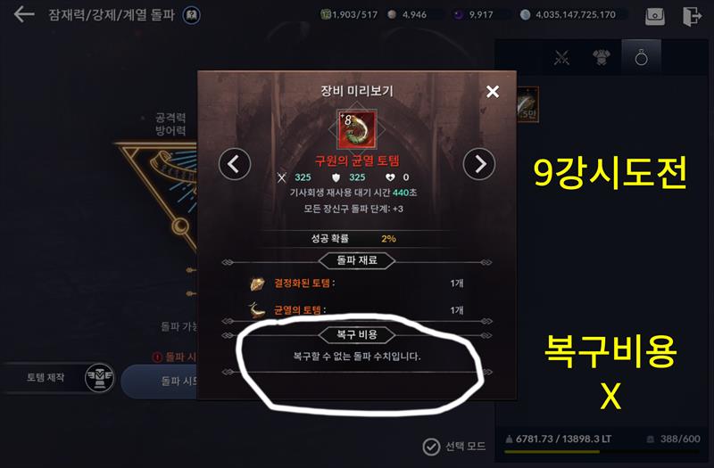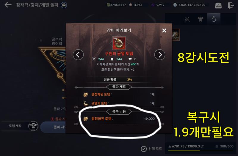 결정화된 토템으로 복구할수 있는 강화 스택이 7강까지이고