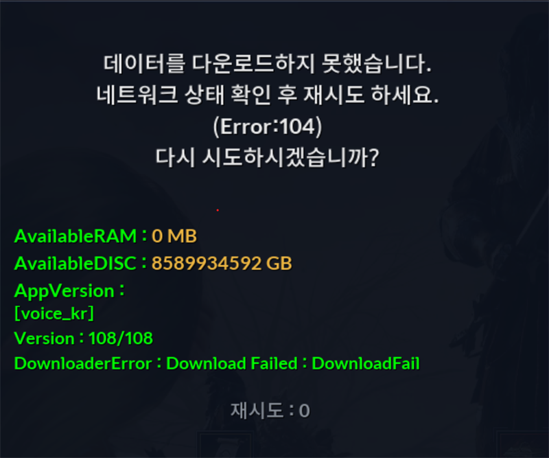 선생님들 pc버전 다운로드 했는데 네트워크 에러 (에러104) 도와주십쇼
