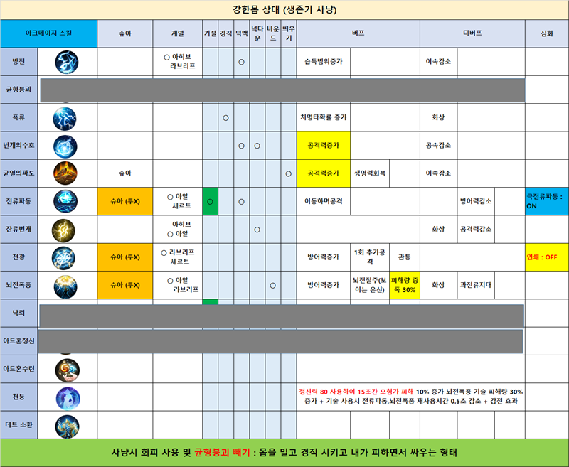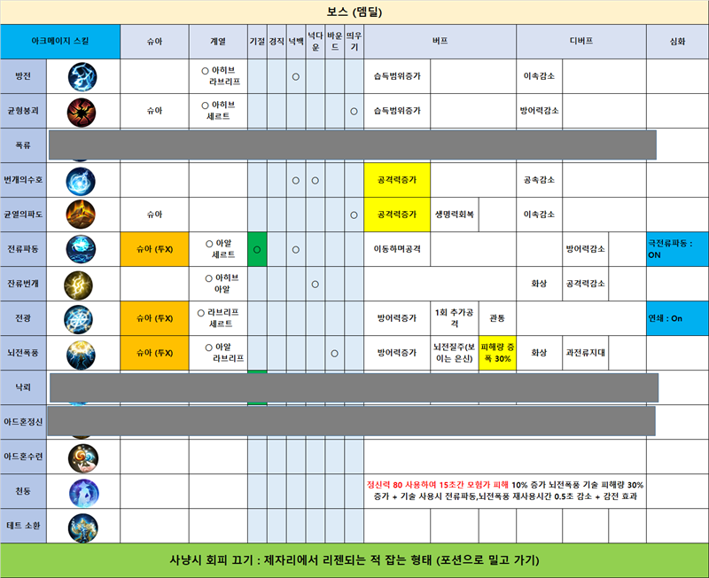 따라서 전광의 연쇄를 꼭 사용 하고, 판대로 전류파동의 극 전류파동은 반드시 끕니다, (사냥시 회피 사용도 끔)